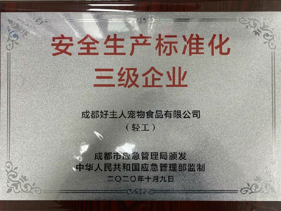 近日,成都好主人宠物食品有限公司荣获由成都市应急管理局颁发的全生产标准化三级企业证书。