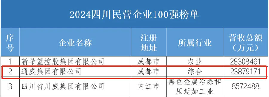 10月29日,四川省工商联发布“2024四川民营企业100强”榜单和《2024四川民营企业100强调研分析报告》。其中,通威集团以第二名荣登榜单.