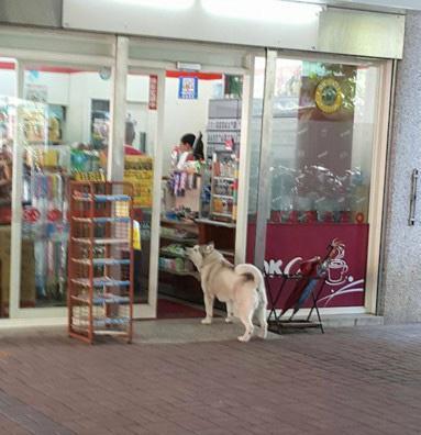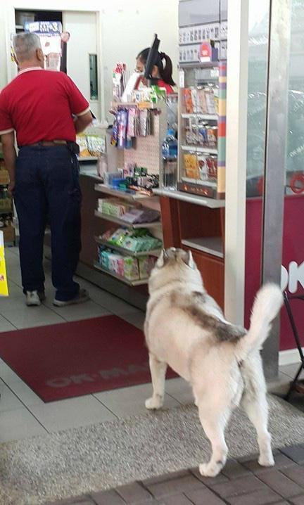 台湾一网友在家门口便利店看到有趣的一幕:一只哈士奇在路上偶遇一位红衣大伯,结果大叫着逼人家往便利店走。