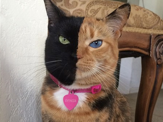 生物学家说,这种异常规则的毛色划分非常罕见,可能与基因相关。研究猫基因的加利福尼亚大学教授莱斯利·莱昂斯说,维纳斯发育过程中,可能半边脸的细胞全部随机选择黑色,另半边选择黄色,然后它们在脸中间相遇。
