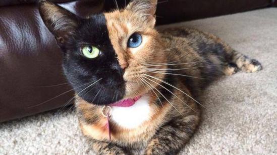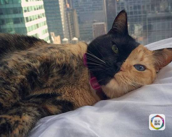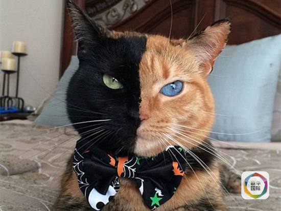 不爽猫、愤怒猫、惊讶猫、斗眼猫,现在又来了“分裂猫”。 这只5岁的猫名叫“维纳斯”,左脸为黄色,右脸为黑色,分界线正好位于脸中央。不止如此,它的眼睛和胡须颜色也不一样,黑脸一侧的眼睛是绿的,胡须是黑的;黄脸一侧是蓝眼睛、白胡子。